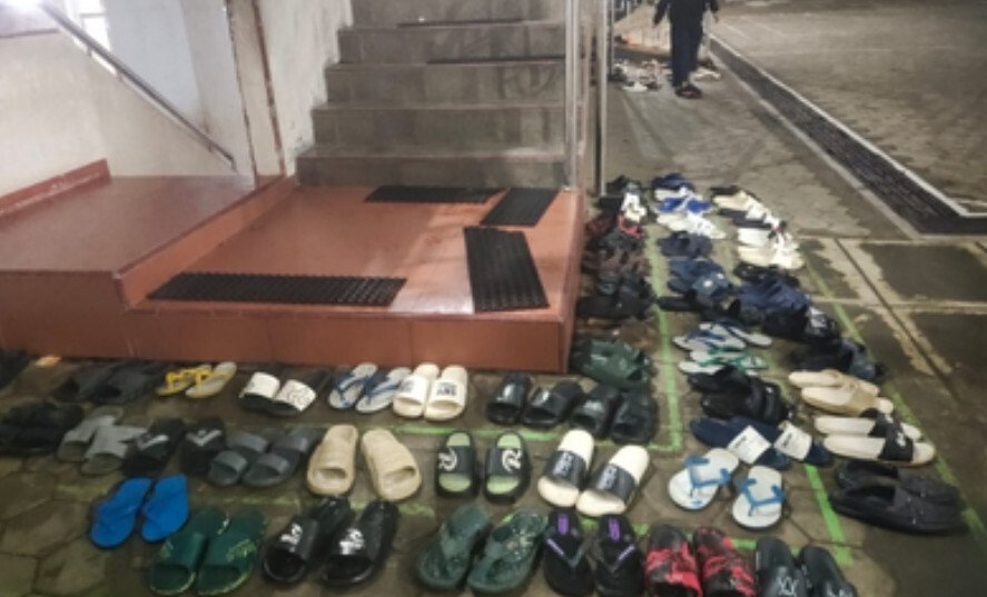 Gambar sandal tersusun rapih diluar mesjid. Foto: LINES