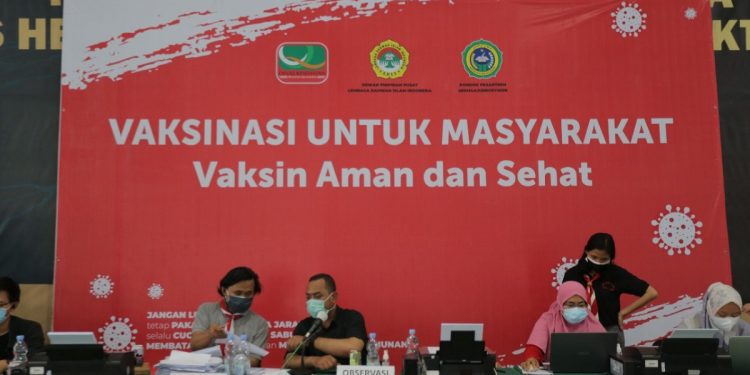 Jakarta (14/7). Puskesmas Cipayung berkolaborasi dengan DPP LDII dan Ponpes Minhajurrosyiddin, berhasil memvaksin lebih dari 15.000 orang sejak 14 Juni 2021 lalu. Pencapaian ini turut menyumbang keberhasilan Pemda DKI Jakarta, yang menarget per 11 Juli, sebesar 5,44 juta warga atau 61,7 persen dari target yang divaksin.
